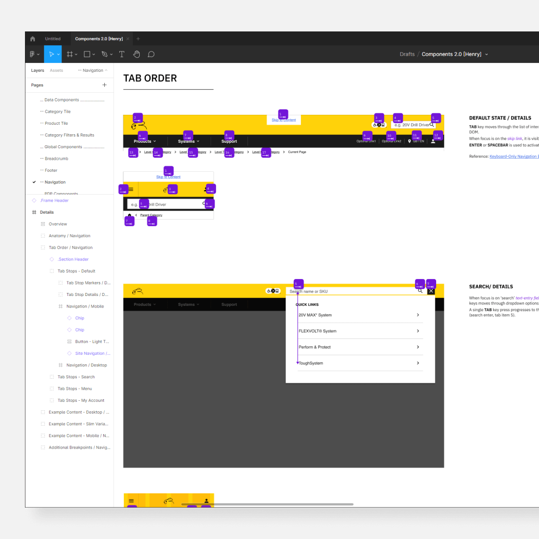 Each component had thorough documentation, specifying interactive states, minimum and maximum content, additional breakpoints, tab stops, keyboard control requirements, and more.