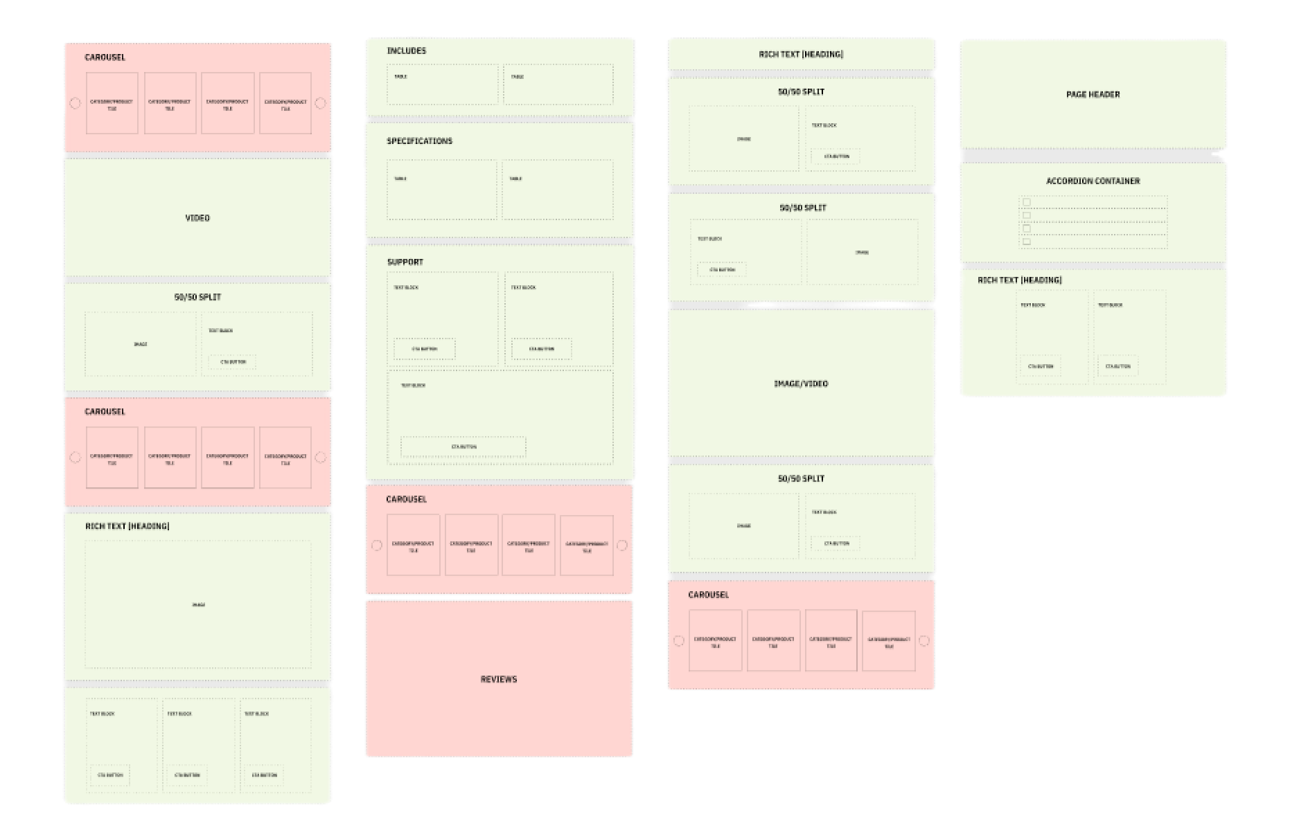 To begin systemizing the interface, a teammate and I conducted an audit of current brand marketing websites across regions. The purpose of this was to collect a visual inventory that documents inconsistencies and defines the essential design patterns and elements. This information was the basis for determining components and patterns.