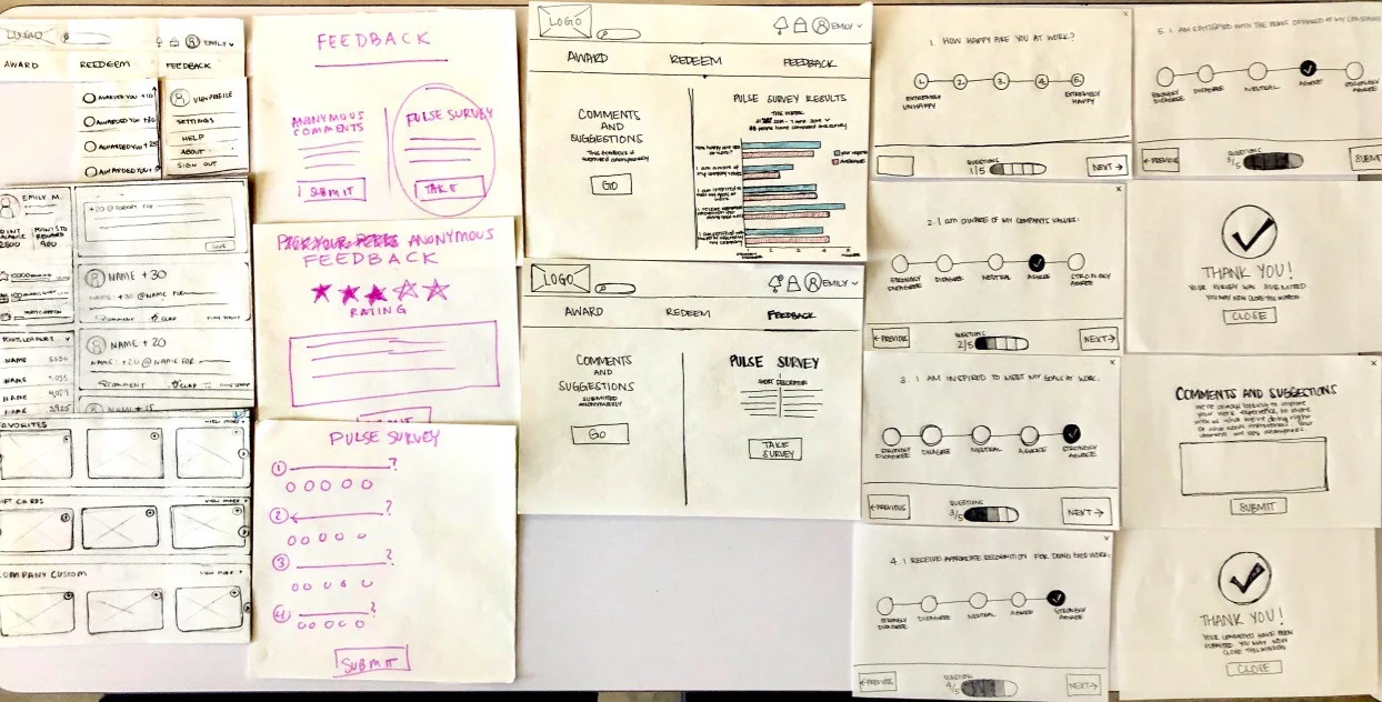 We went through several rounds of sketching to explore different concepts and test their usability. We were able to use feedback to design our paper prototypes, which were tested to evaluate the flow and intuitiveness.